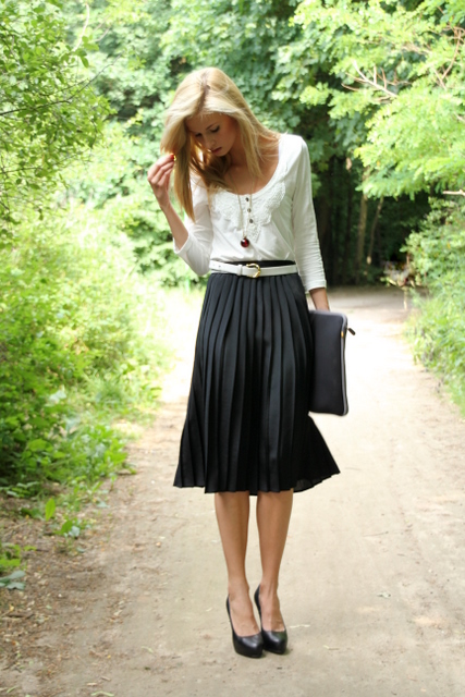 Dzisiejszy zestaw trochę w stylu vintage. Plisowaną spódnicę upolowałam już jakiś czas temu w second handzie. I gdy wreszcie nadarzyła się okazja aby ją założyć,od razu z niej skorzystałam. Długość midi to jedna z najtrudniejszych długości do zestawienia. Trzeba bardzo uważać, co do niej dobieramy aby nie skróciła nam nóg. Ja połączyłam ją z białą bawełnianą bluzką, białym paskiem, naszyjnikiem od ROMWE oraz czarnymi klasycznymi szpilkami. Zdaje sobie sprawę, że zestaw większości z Was może się nie spodobać: klasyka,czerń i biel – nuda… Ja jednak dobrze czuje się w tym zestawie, dlatego postanowiłam Wam go pokazać.