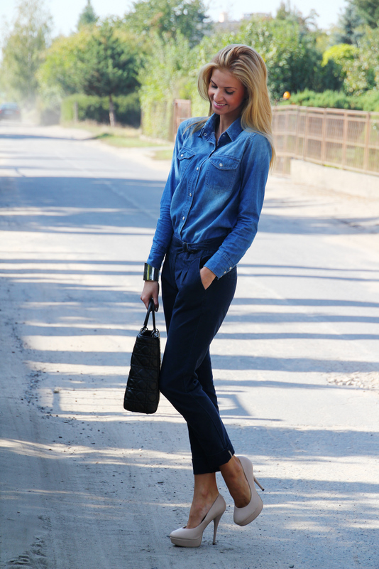 koszula rzeczywiście świetna:) nie lubię takiej długości spodni, ale z kolei długość nóg i wysokie obcasy „ratują” stylizację. no i zestawienie niebieskiej koszuli z Twoim blondem… smacznie:)