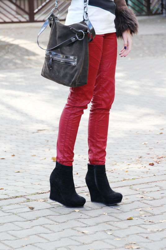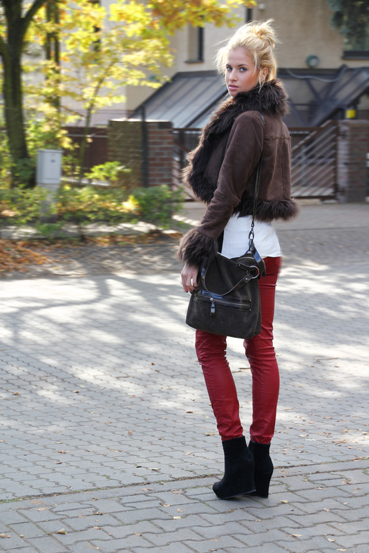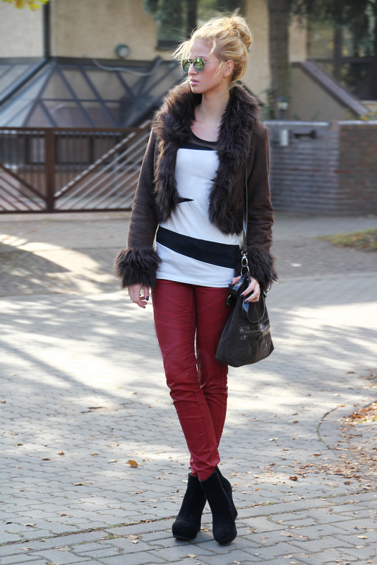 W dzisiejszym zestawie prezentuję Wam mój must have na ten sezon: burgundowe rurki. Połączyłam je z geometryczną bluzką i kurtką (futerko przy niej jest sztuczne 🙂 )