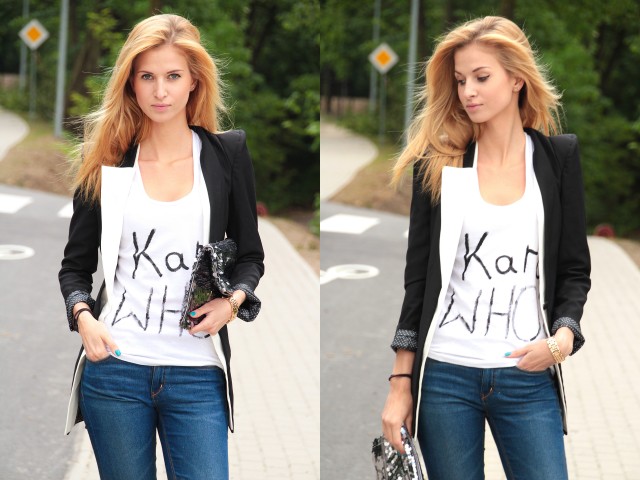 B&W to nieśmiertelny i ponadczasowy wybór. Ja uwielbiam zarówno białe topy jak i czarne marynarki – to zawsze wygląda dobrze. W takich zestawach jak dziś czuje się najlepiej.