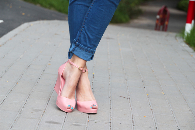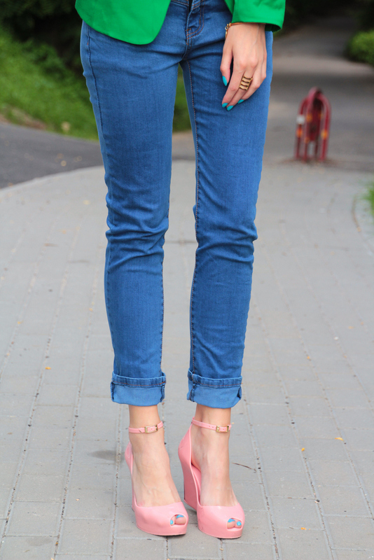 Odnoszę wrażenie, że w zieleni Ci jednak nie do twarzy i że średnio zgrywa się ten kolor z jeansami i pudrowymi koturnami. Ten zestaw mi się wyjątkowo nie podoba 🙁
