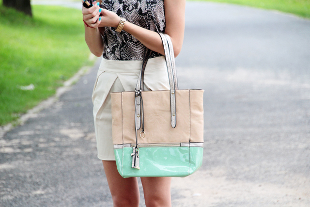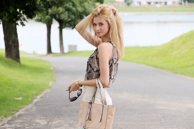 Mam już dosyć co chwilę zmieniającej się pogody. W ciągu dnia z pięć razy pada i świeci słońce, nie wspominając o temperaturze, która zmienia się jak w kalejdoskopie. Dziś mam dla Was elegancki zestaw, z gorących i słonecznych dni. Spódniczkę możecie kojarzyć z postów sprzed roku – po raz kolejny wkradła się w moje łaski. Bluzka z motywem zwierzęcym to duże ryzyko (osobiście nie przepadam za tym trendem), jednak ta urzekła mnie swoim fasonem. Przy takich wzorach należy pamiętać aby nie przesadzić. Torebka i buty to nowości, których byliście bardzo ciekawi 🙂