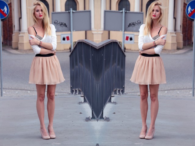 Ten stanik jest genialny! Jednak ginie gdzieś w całej tej delikatności reszty zestawu przez co wygląda trochę jak intruz… Jest ładnie, ale lepiej by było, gdyby nie był on taki osamotniony- trochę cięższe buty i jeszcze jakieś dodatki w klimacie i lakier czarny;)