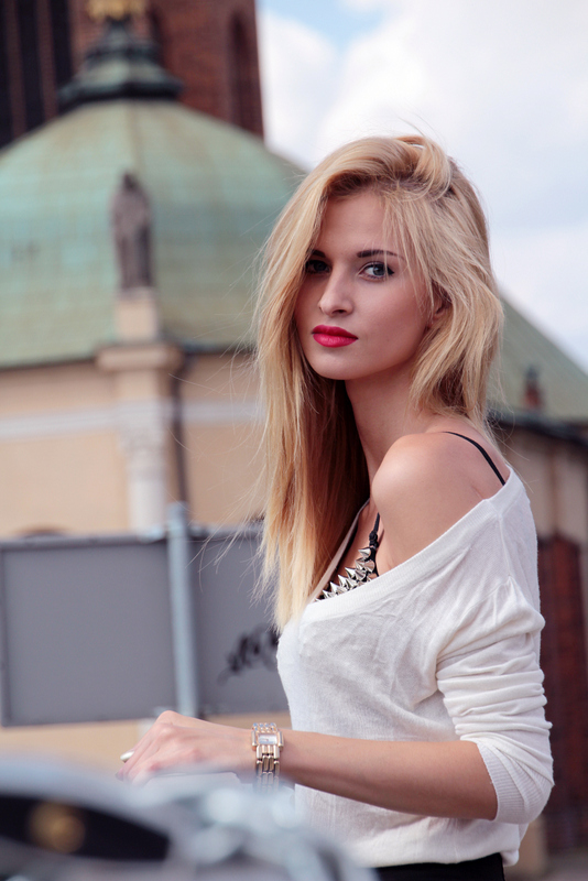 Dziś długo wyczekiwany zestaw. Gdy tylko zobaczyłam stanik z ćwiekami od razu miałam dwie wizje: pierwsza romantyczna (ta dzisiejsza), druga natomiast ostra (tą pokaże za jakiś czas). Wybrałam do niego sweterek, który długo czekał na swoją premierę. Jest dość duży i opada na jedno ramię – w tym przypadku jest to idealne rozwiązanie. Nie chciałam pokazywać całego stanika, wtedy ta subtelność gdzieś by zanikła, natomiast tak jest intrygująco. Mam nadzieję, że zestaw Wam się spodoba. Enjoy !