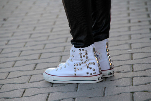 Uwielbiam ćwieki, uwielbiam skórzane „dodatki” i właśnie to wykorzystałam w dzisiejszym zestawie. Jest prosto, casualowo, lecz z nutką elegancji – czarny strój ożywiony jedynie białymi trampkami. Skórzane rękawy płaszcza + skórzane spodnie nadają charakteru całości. Wracając do ćwieków….. gdy tylko usłyszałam o możliwości stworzenia własnych trampek i to Conversów (które uwielbiam) ani chwili się nie wahałam. Od razu wiedziałam jak będą wyglądać. Mam już zwykłe białe, czarne, fioletowe, … dlatego te, które zaprojektowałam na remiza.pl są w 100% „MOJE”. Napis BFS z ćwieków może i na pierwszy rzut oka nie jest bardzo widoczny, ale przez to trampki są osobiste (tak wiem, dziwnie to brzmi ^^). Ponadto dodałam jeszcze z tyłu ćwieki w lini prostej. Jestem nimi zachwycona ♥ Tymczasem mam nadzieję, że zestaw Wam się spodoba !!! 🙂