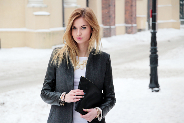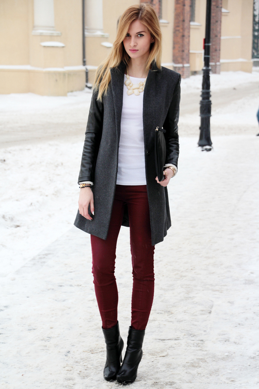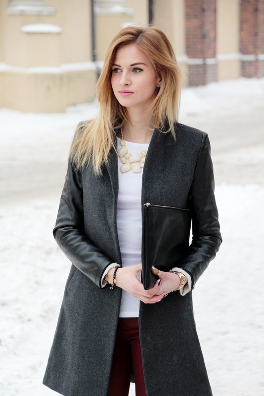 Gdy przychodzi co do czego zawsze okazuje się, że brakuje w mojej szafie bazowych topów. Niby są ale ich nie ma (podejrzewam, że większość tak ma) ^^ Dlatego, korzystając z przecen postanowiłam zaopatrzyć się w sporą dawkę białych klasycznych topów, t-shirtów i bluzek. Dzisiejszą bluzkę znalazłam w Zarze i jest naprawdę świetna zarówno jeśli chodzi o fason jak i jakość. Wystarczyło połączyć ją z burgundowymi spodniami, idealnie skrojonym czarnym płaszczem i zamierzony efekt gotowy – elegancko i klasycznie. Co do burgundowych spodni, które (nie wiem czy pamiętacie) tak bardzo lubiłam, to po dłuższej przerwie wracają do łask 🙂  Mam nadzieję, że zestaw Wam się spodoba !