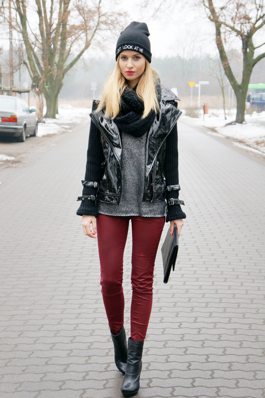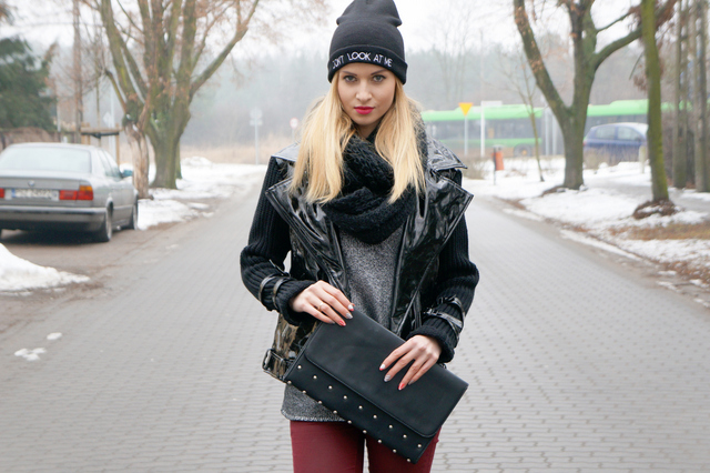 Ostatnio jeśli stawiam na czapki to mój wybór pada na popularną w tym sezonie beanie czyli „czapkę krasnala”. Szczerze ? Uwielbiam je i jak mogliście zauważyć kilka takich znalazło się w mojej szafie. Tym razem nowa do kolekcji z napisem „dont look at me”. Jeśli chodzi natomiast o kurtkę, nie byłam pewna, czy nada się na aktualną pogodę za oknem, jednak rękawy są naprawdę bardzo ciepłe, a zakładając pod spód sweter na pewno nie zmarzniemy. Dzisiejsza kolorystyka to czerń, metal i burgund – mam nadzieję, że to połączenie Wam się spodoba.