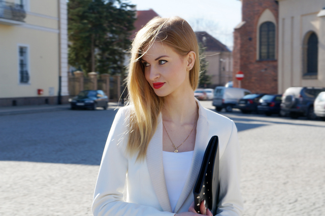 Dodając tego posta śmieję się w duchu sama do siebie. Zawsze jest tak, że korzystam z pięknej pogody, robię zdjęcia a kiedy wstawiam dany zestaw z ciepłych dni – bach ! Zima powraca 🙂 Mam jednak nadzieję, że za parę dni słońce znowu się pojawi i nareszcie nadejdzie WIOSNA. Niemniej dzisiejszy set to zestawienie czerni i bieli w dosyć oryginalnym połączeniu. Spodnie z paskami już od jakiegoś czasu królują w świecie mody – u mnie w szafie po raz pierwszy. Podobnie jest z białym klasycznym żakietem, którego zdecydowanie brakowało w mojej garderobie. Podoba Wam się takie połączenie ? I wyprzedzając już pytania: nie miałam gołych nóg 🙂