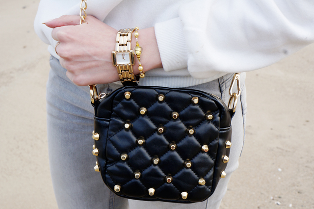 W dzisiejszym zestawie dominuje biel z szarością. Dodatki w postaci czerni podkreślają jeszcze mocniej kolor bluzy i spodni. Conversy to zdecydowanie moje ulubione trampki: do czterech par za kostkę dołączyły kolejne – te z dzisiejszego zestawu. Całość tworzy luźny set ale złota biżuteria + łańcuch przy torebce nadają nutki elegancji. Hope you like it !