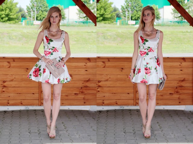 Sukienka w kwiaty – też mi nowość! Nigdy nie przepadałam za kwiatowymi wzorami, ale są takie rzeczy, które po prostu podbijają moje serce. To jest właśnie ta rzecz. Sukienka jest niezwykle urocza i dziewczęca. Zestawiłam ją z brązowymi dodatkami. Sandały są bardzo wygodne oraz stabilne (pomimo swej wysokości) i idealnie wpasowują się w charakter stylizacji. Dajcie znać czy Wam się podoba 🙂